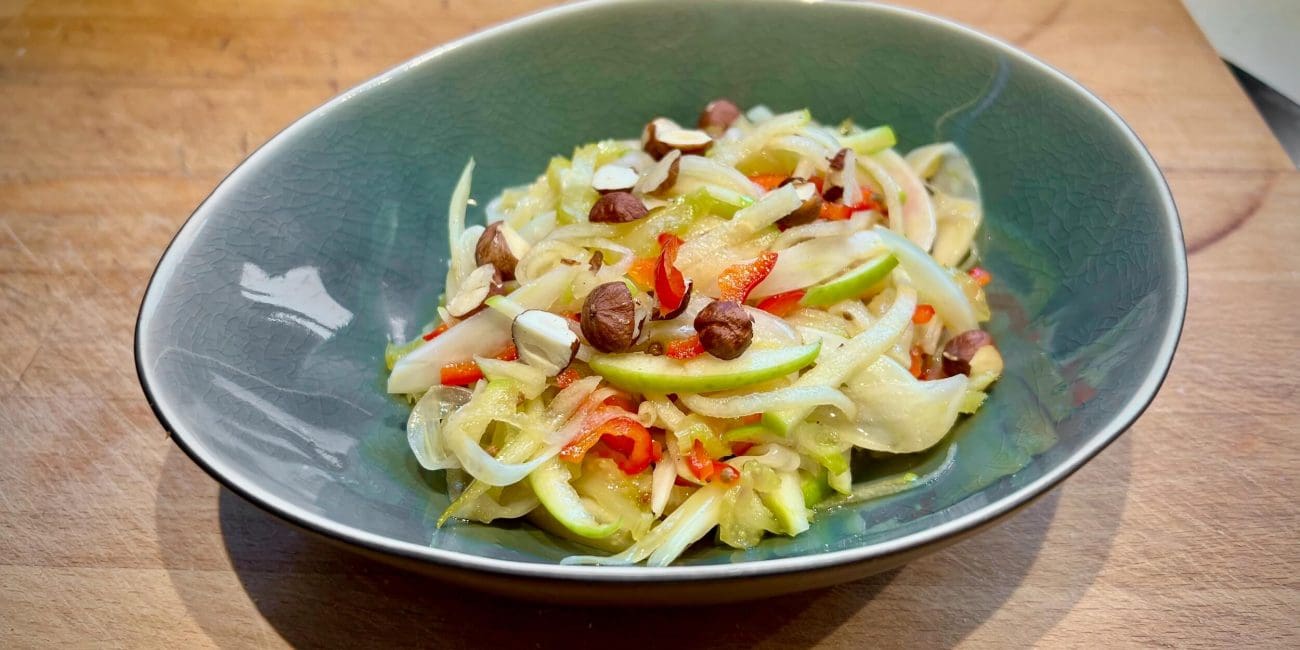 Fruchtiger Fenchel-Staudensellerie-Salat mit Apfel, Birne & gerösteten Haselnüssen