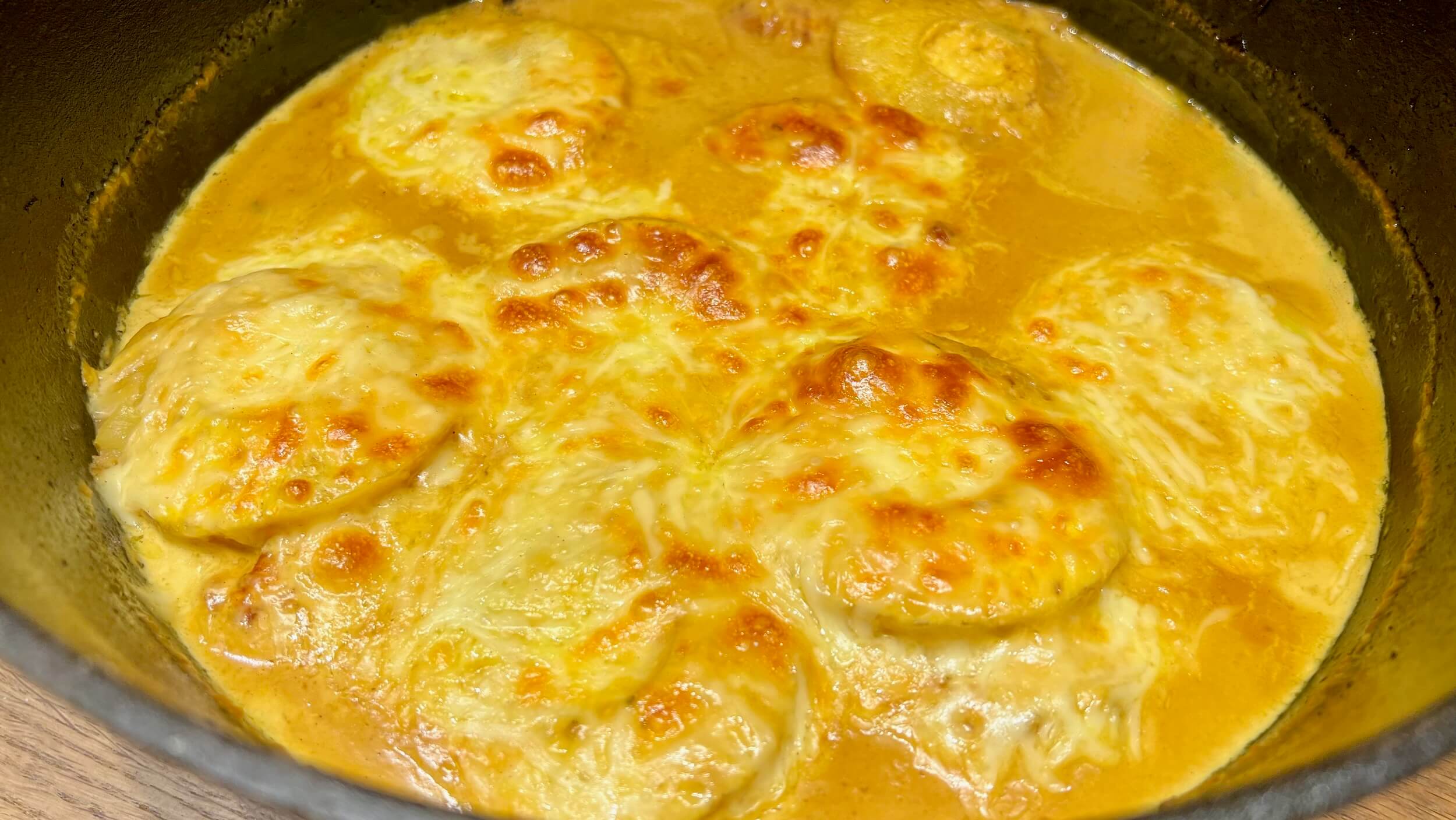 Wir schließen den Deckel und legen 8 Kokoko Eggs darunter und 8 auf den Deckel. Nun lassen wir das Gericht eine Stunde garen. Die Sauce wird cremig, das Hähnchen bleibt saftig und die Aromen verbinden sich optimal.
