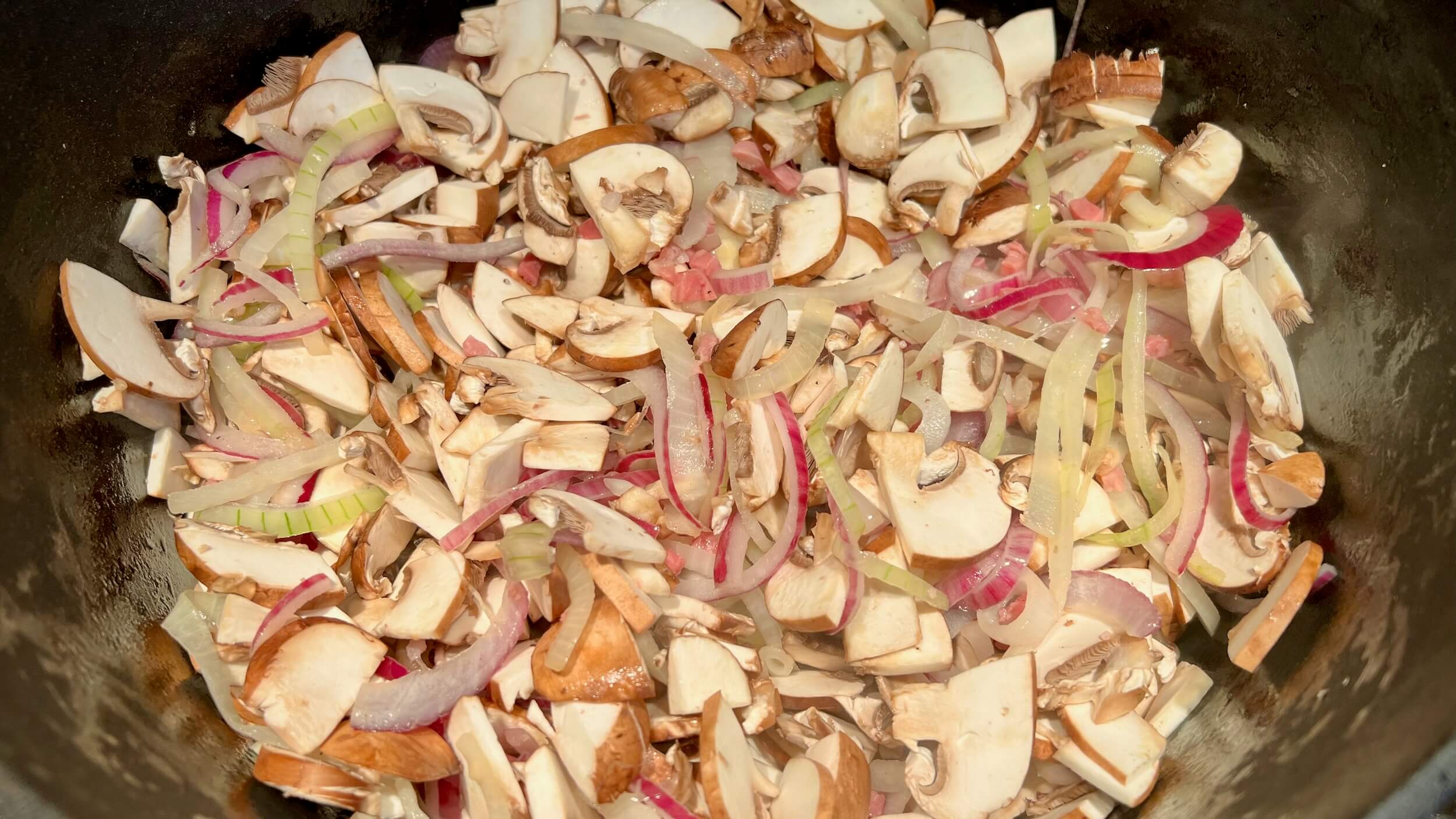 Wir beginnen damit, die Champignons gründlich zu putzen und in Scheiben zu schneiden. Die Zwiebeln ziehen wir ab, halbieren sie und schneiden sie in Ringe. Dadurch sind alle frischen Zutaten vorbereitet und wir können später ohne Unterbrechung arbeiten.
