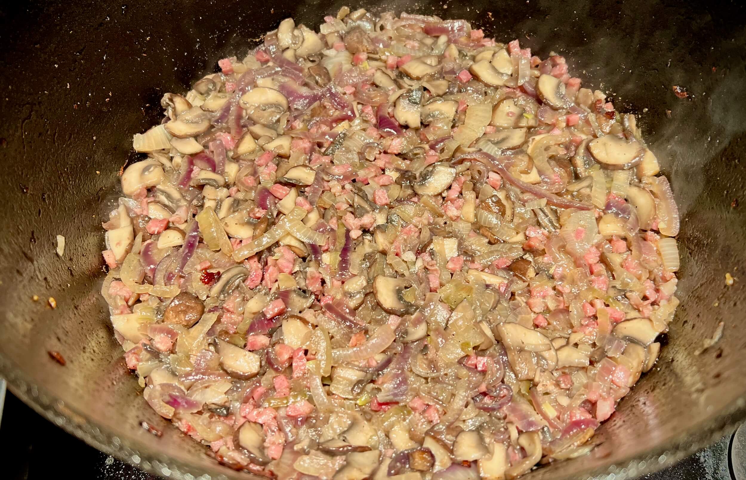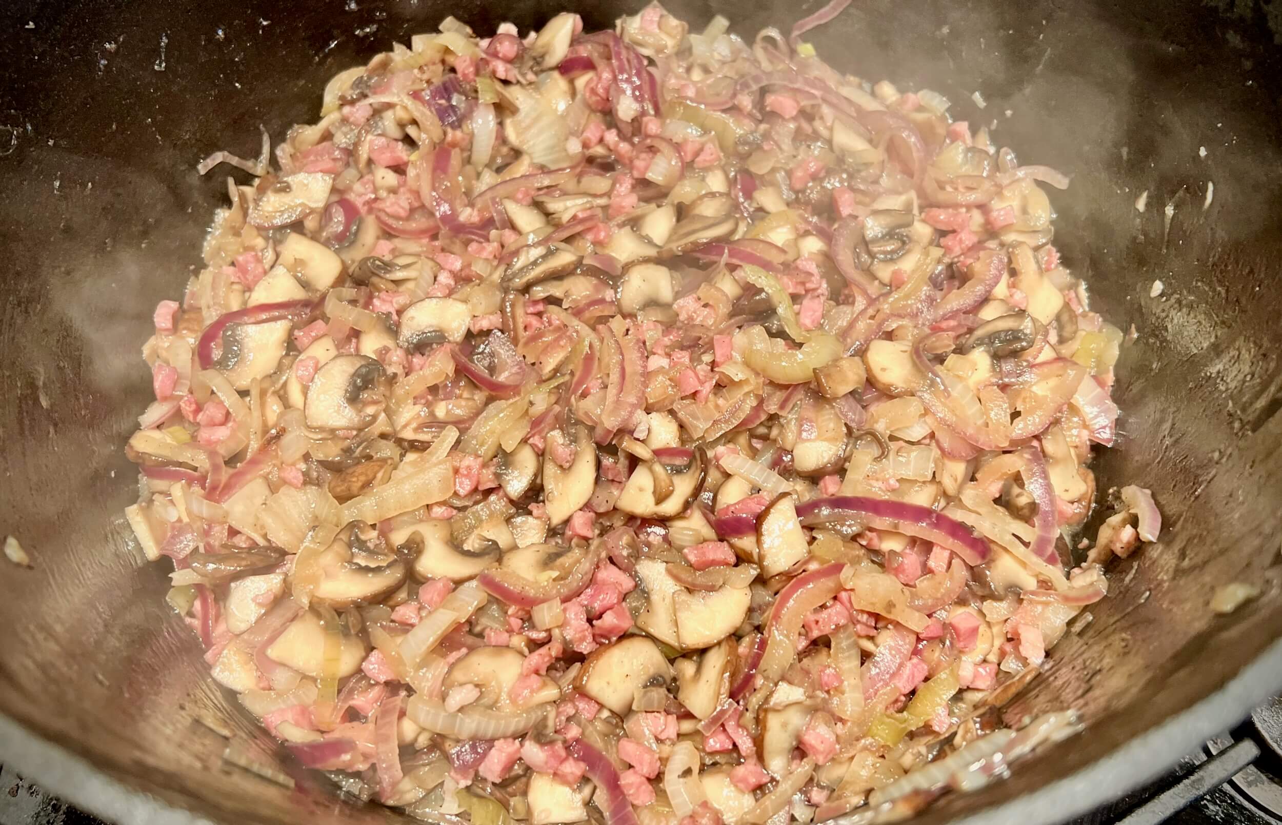 - 50 g Butter im Dutch Oven zerlassen, Speck darin anbraten. Zwiebeln und Champignons zugeben und mitbraten. Mit Salz und Pfeffer würzen.