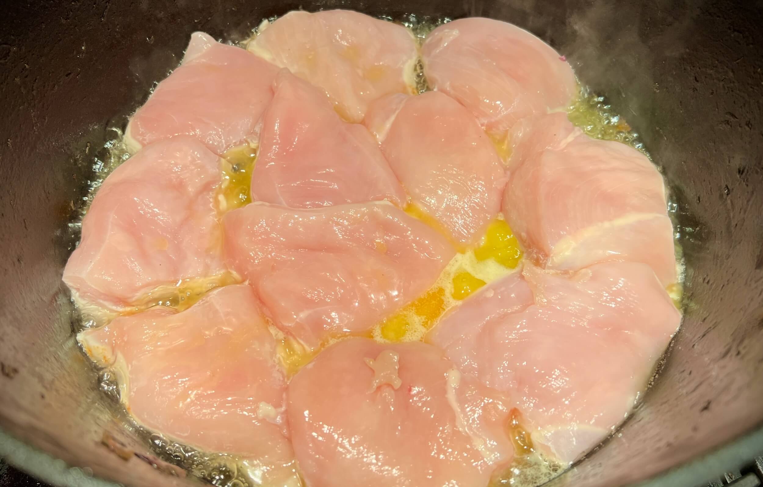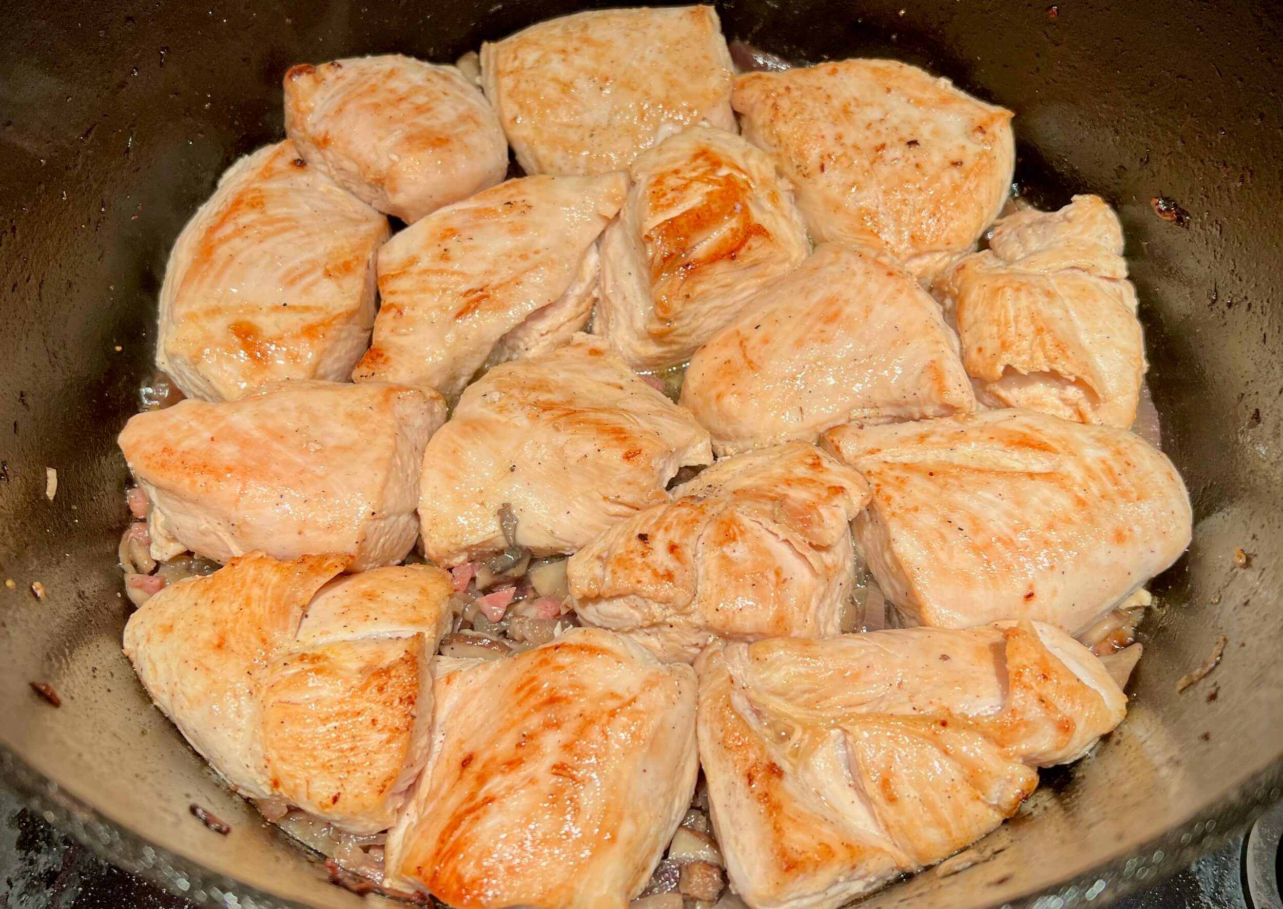 Jetzt geben wir den Rest der Butter in den Dutch Oven und braten die Hähnchenbrustfilets scharf an. Sie dürfen dabei ruhig leicht braun werden – diese Röstaromen tragen enorm zum Geschmack des Feuertopfes bei. Nach dem Anbraten würzen wir die Filets mit Salz und Pfeffer und nehmen sie wieder heraus.
