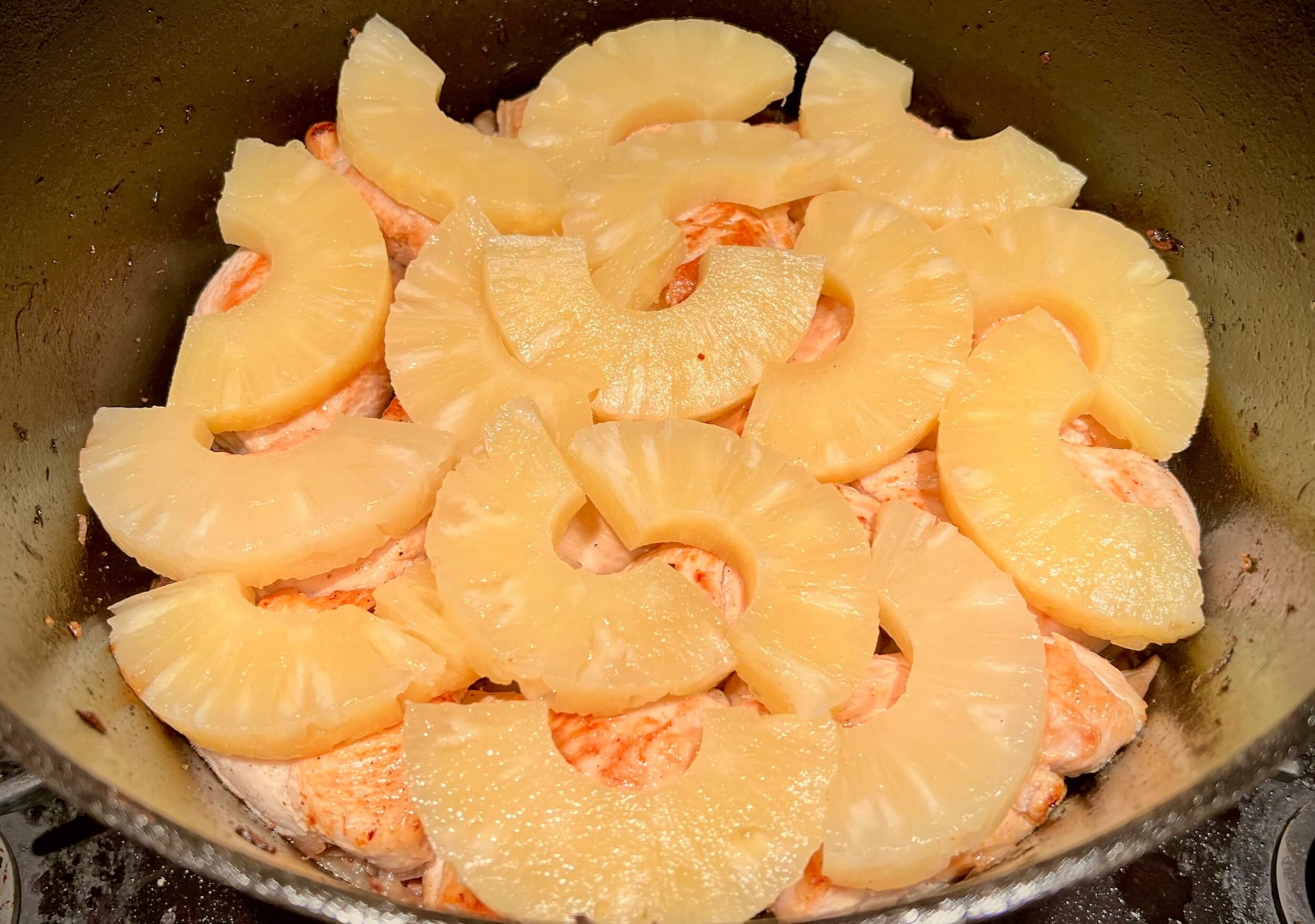 - Champignons, Speck und Zwiebeln als Basis in den Dutch Oven geben. Hähnchenbrustfilets darauflegen und auf jedes Filet eine Ananasscheibe setzen.