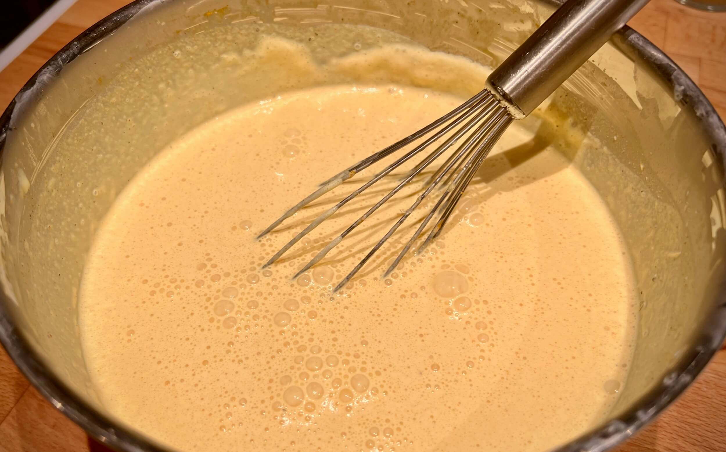 In einer großen Schüssel verrühren wir Schmand und Sahne, geben Curry, Pfeffer und Salz hinzu und pressen die Knoblauchzehen hinein. Danach gießen wir den Saft der Ananasdose dazu – er sorgt für die typische fruchtige Süße (vorsichtig dosieren und immer wieder abschmecken). Wir mischen alles gründlich und schmecken die Sauce ab.
