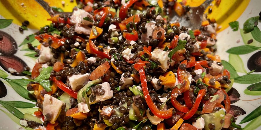 Bunter Beluga-Linsensalat mit Gurke, Karotte und Feta