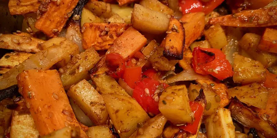 Saisonales Wurzelgemüse, Kürbis und Co. eignen sich hervorragend für dieses Ofengemüse, das Dank der Harissapaste einen wunderbar orientalischen Geschmack bekommt.