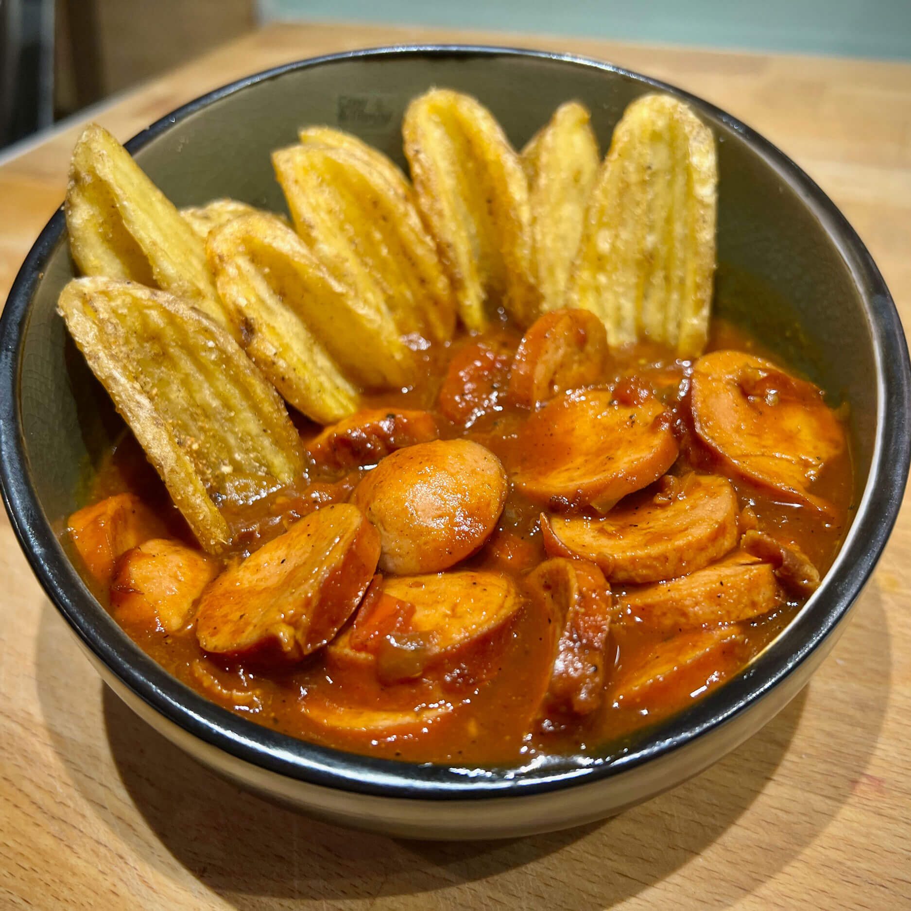 Auch den Imbissbuden-Klassiker kann man hervorragend im Dutch Oven zubereiten. In unserem Rezept findet ihr auch die Zutaten für eine fruchtig-pikante Currysauce. Alles ist mit wenigen Handgriffen erledigt und gelingt immer.