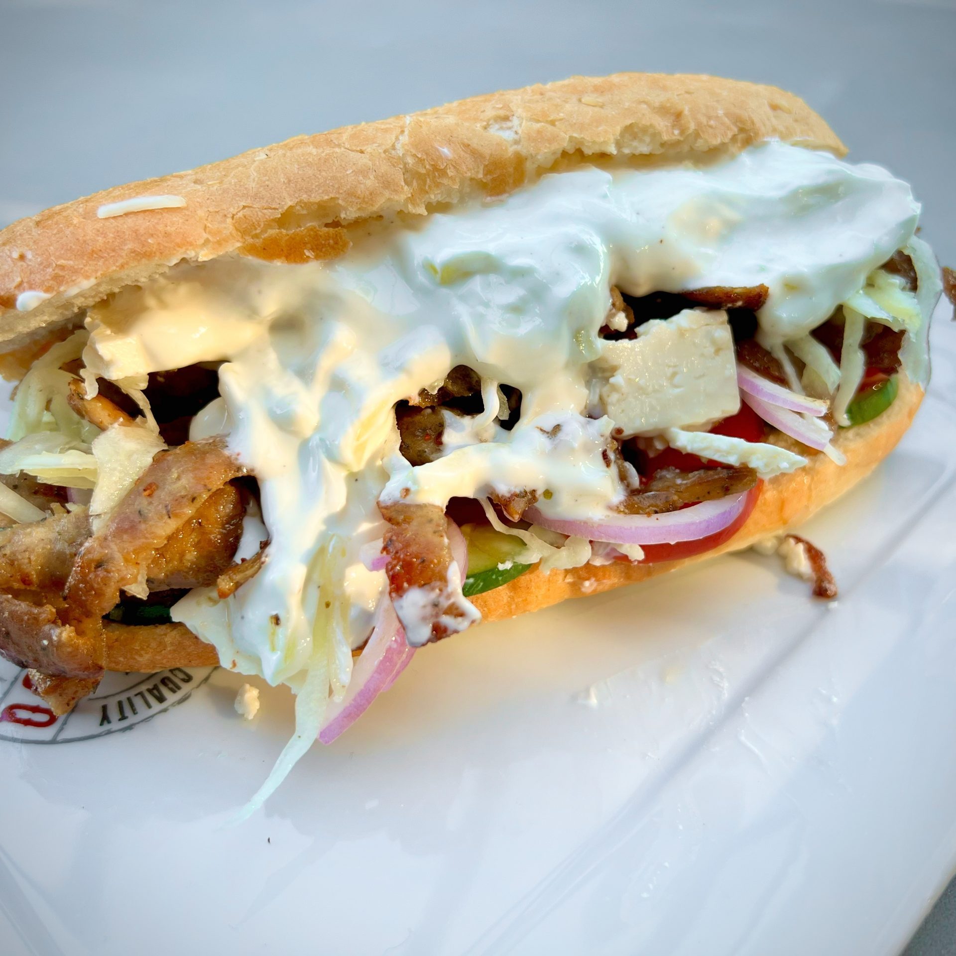 - In das Fladenbrot schichten wir jetzt: Gurken, Tomaten und Zwiebeln. Dann ein drittel der Bratwurststreifen, darauf kommt der Krautsalat, der Hirtenkäse und der Zaziki. Fertig!
