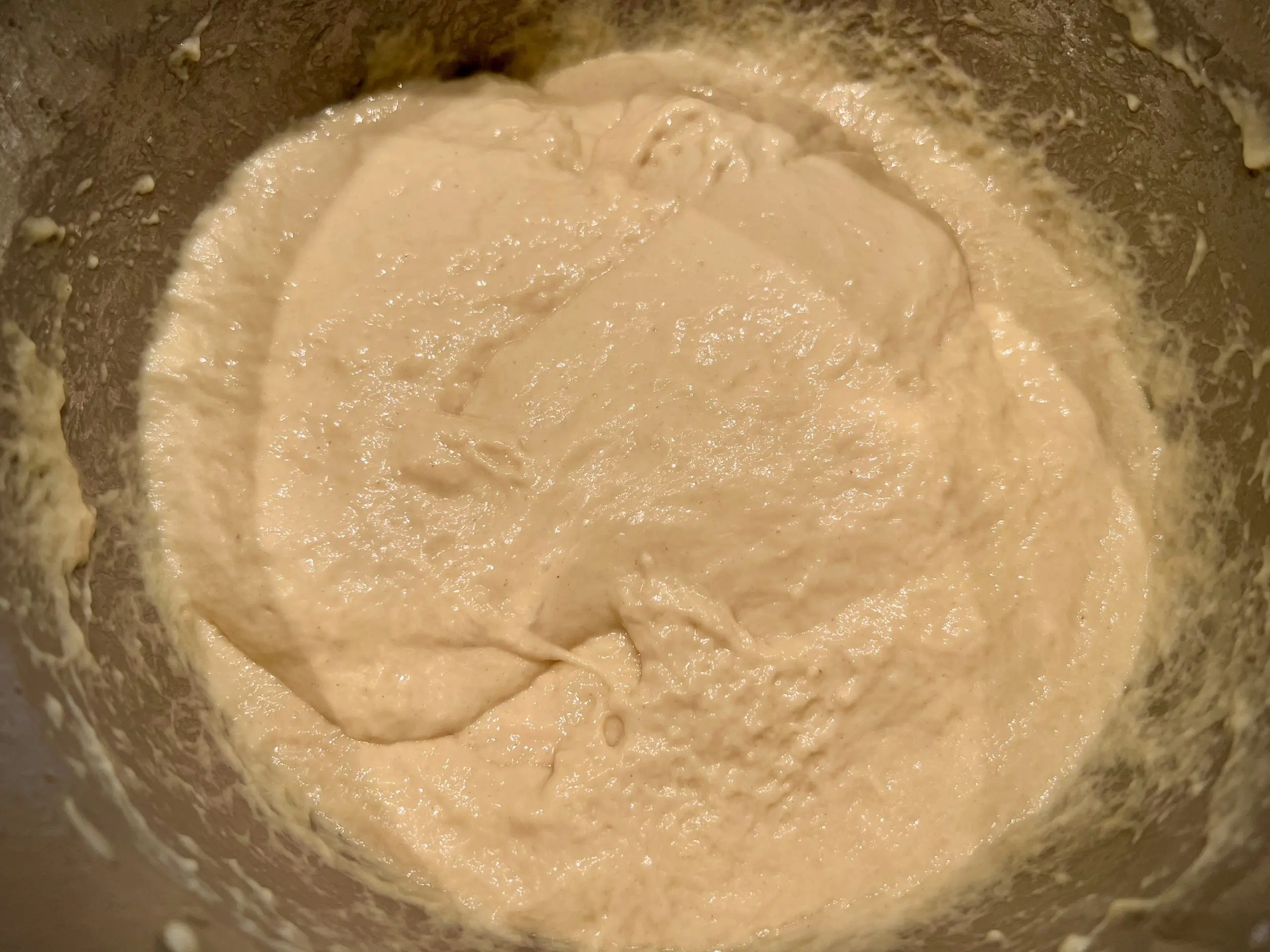 - Der Teig ist nach 10 Minuten noch sehr flüssig, das soll auch so sein! Nun den Teig abdecken und an einem warmen Ort oder mit der Gärstufe im Backofen 1 Stunde gehen lassen.