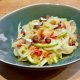 - Staudensellerie entfädeln und ebenfalls in feine Streifen schneiden.
