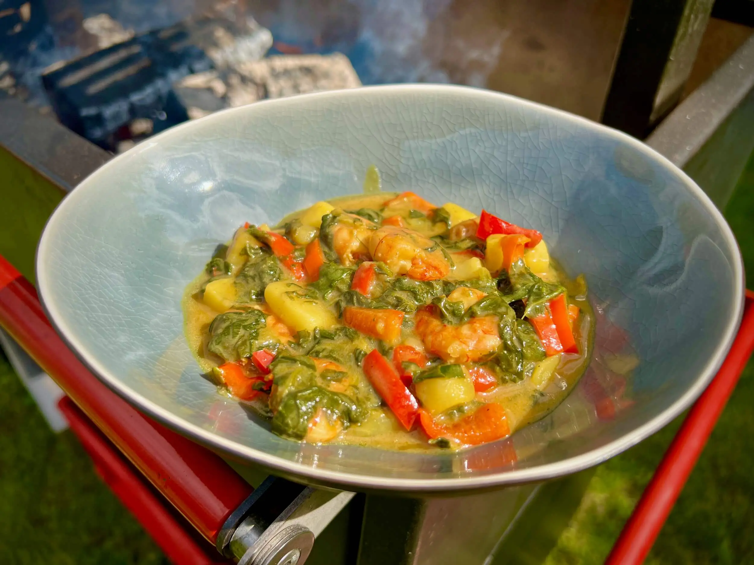 Auf offener Flamme lassen sich im Wok oder der Gusspfanne hervorragend cremige Currys zubereiten. Unser Lieblings-Rezept ist mit Garnelen, Kartoffeln und Spinat mit roter Currypaste und Tamarinde. Einfach zu kochen und super lecker!