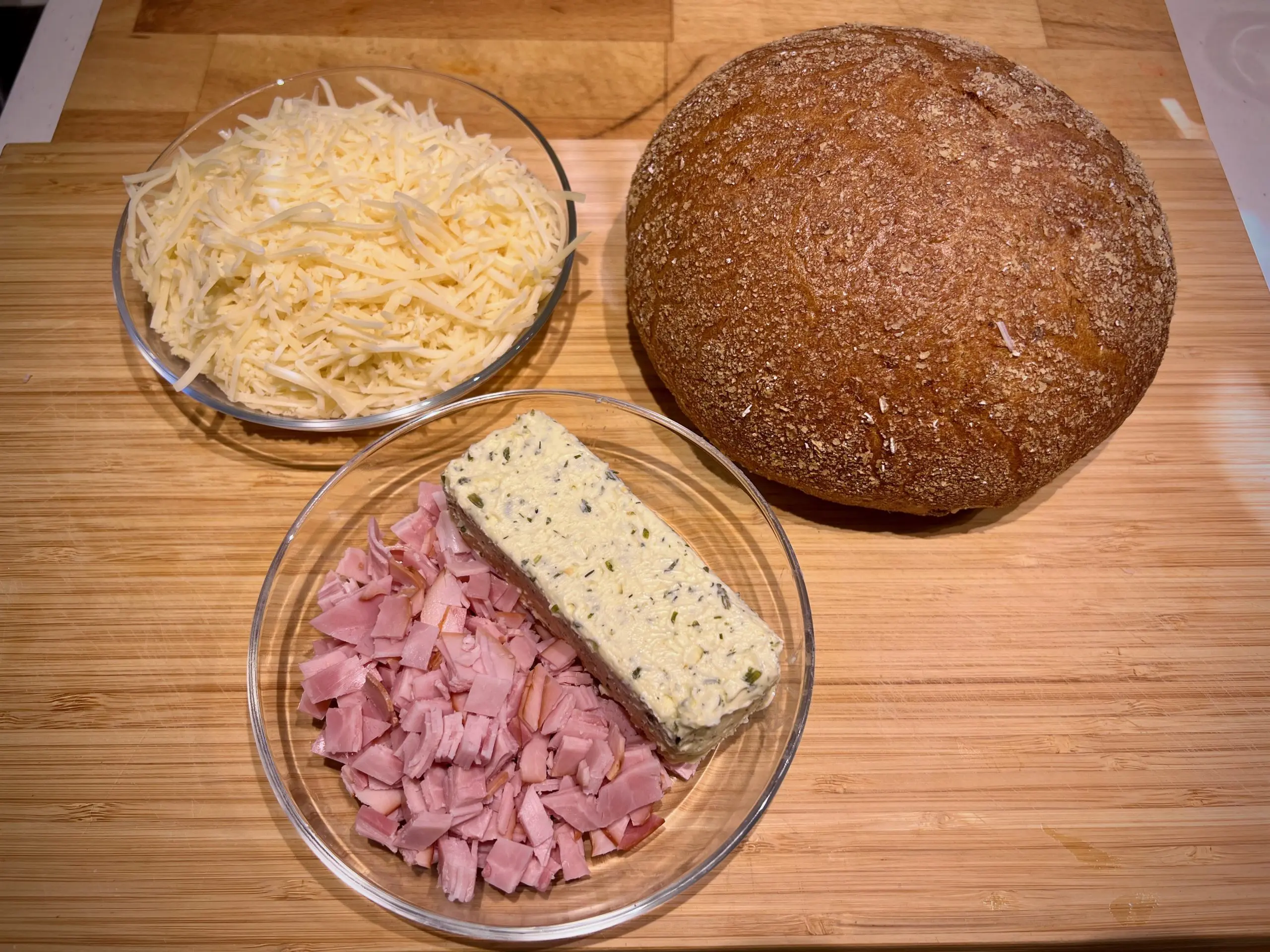 Als erstes richten wir uns alle Zutaten her. Wir schneiden den Schinken in kleine Stücke und raspeln den Käse. Die Zwiebel schneiden wir in feine Scheiben. Wir geben alles in Schüsseln und stellen es zur Seite.