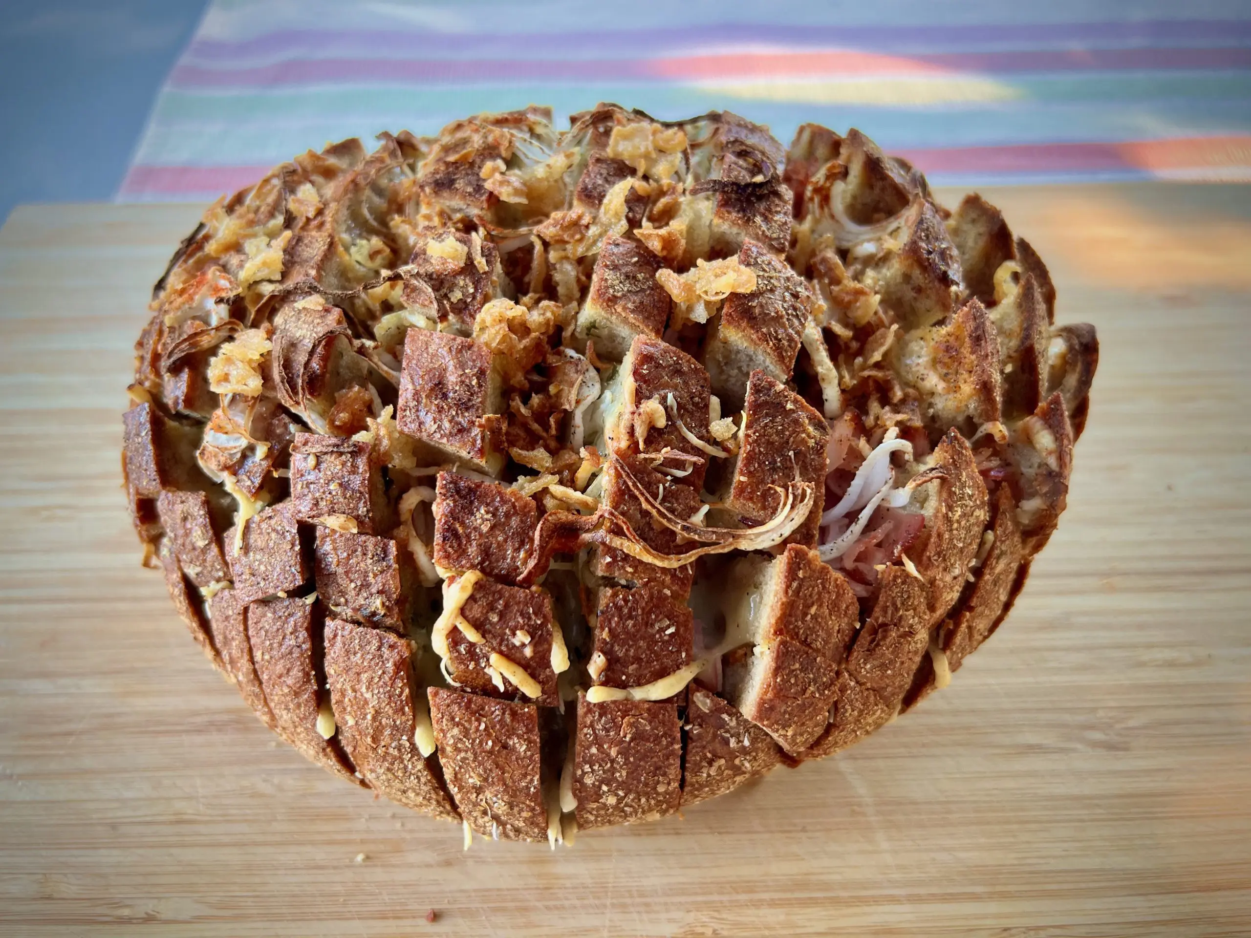 - Das Kartoffelbrot diagonal alle 3-4 cm bis fast nach unten (ca. 2 cm stehen lassen) einschneiden. Dann vorsichtig aufklappen, und die Flächen innen gut mit der Kräuterbutter bestreichen. Dann den Schinken und den Käse gleichmäßig in die Schnitte verteilen. Zum Schluß mit den Zwiebel bestreuen und etwas Paprikapulver darübergeben.