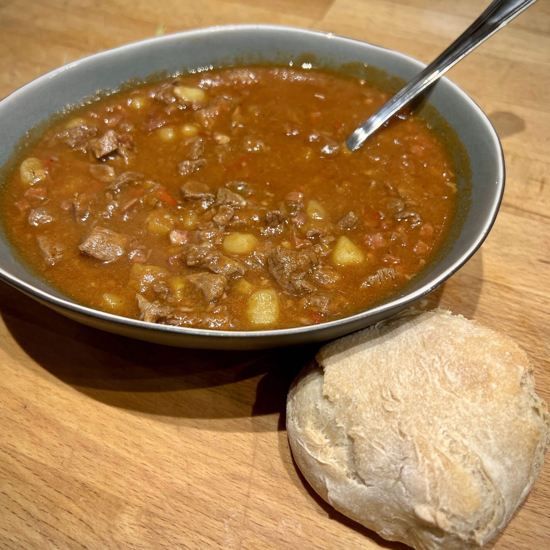 Als Fleisch empfiehlt sich am besten Rinderschulter. Wir haben uns hier für Bio-Rindschulter von unserem örtlichen Bio-Metzger entschieden. Das Rindfleisch wird in 0,5 cm kleine Würfel geschnitten und mit angebraten. Das Ganze mit Salz und Paprika kräftig würzen. Zum Schluss noch das Tomatenmark zugeben und kurz mit rösten.