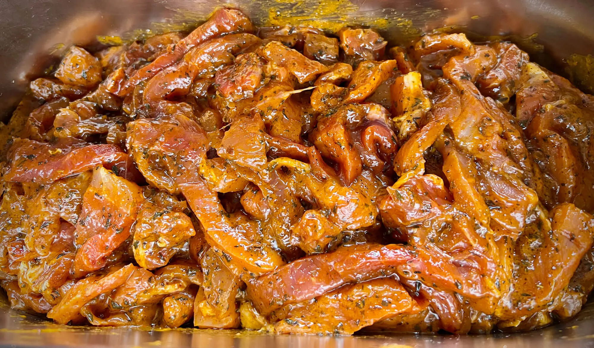 - Gyrosfleisch am Vortag marinieren (oder fertig kaufen) und abgedeckt über Nacht im Kühlschrank ziehen lassen.