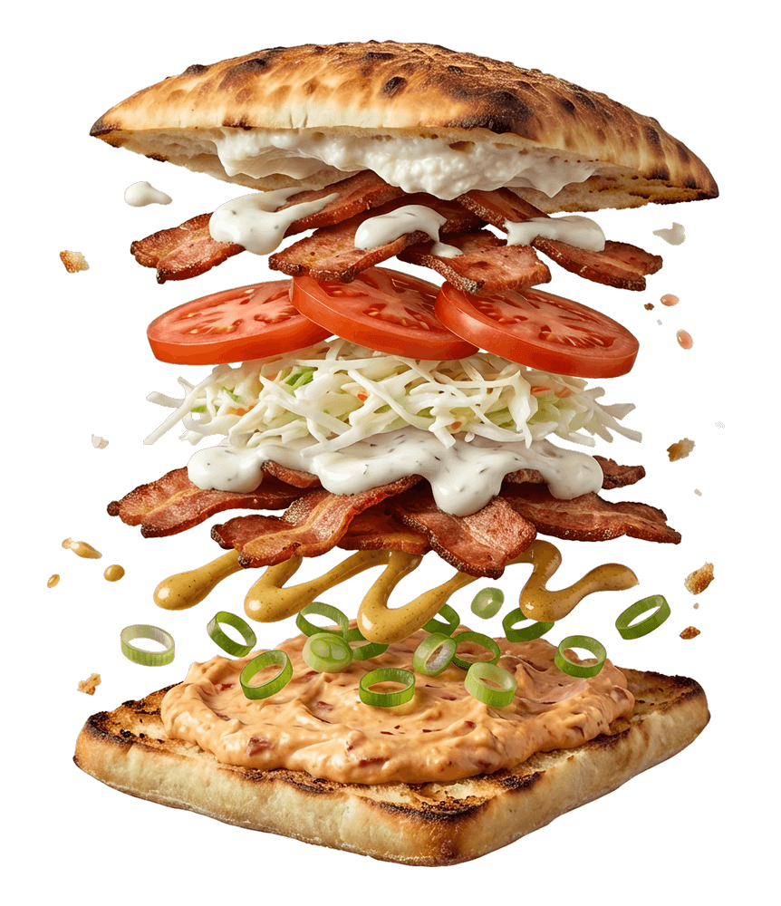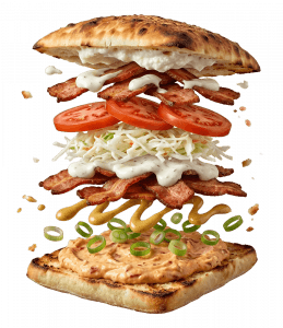 Das folgende Bild zeigt den typischen Aufbau unseres Leberkäs Döners in einzelnen Schichten und verdeutlicht perfekt, wie sich die Aromen zusammensetzen. Von unten nach oben entsteht so ein ausgewogenes Zusammenspiel aus Cremigkeit, Würze, Frische und Röstaromen.