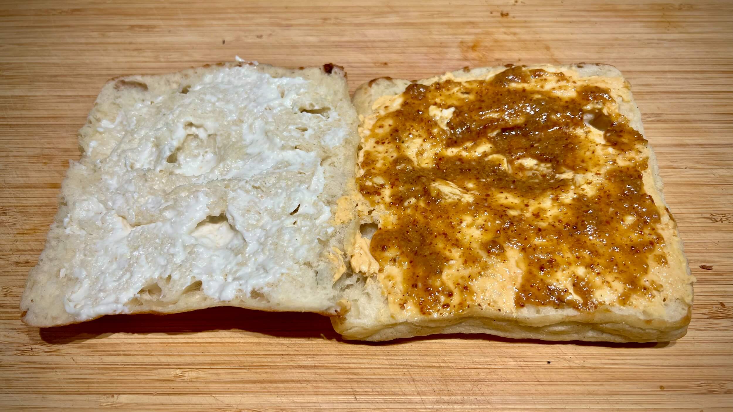 Nun bestreichen wir den Boden mit etwa 50 g Obazda, während wir den Deckel mit 1 EL Sahne-Meerrettich versehen.