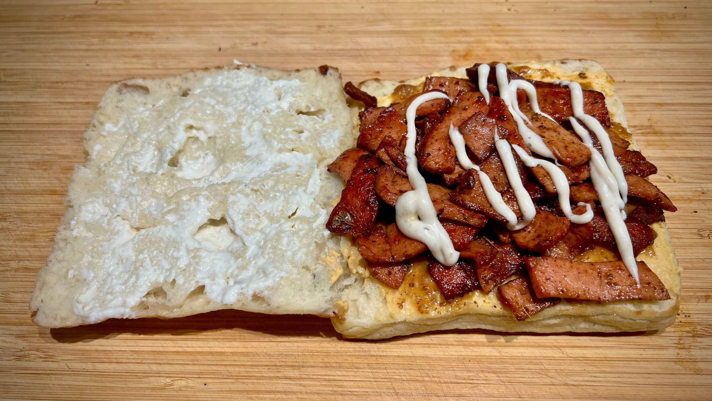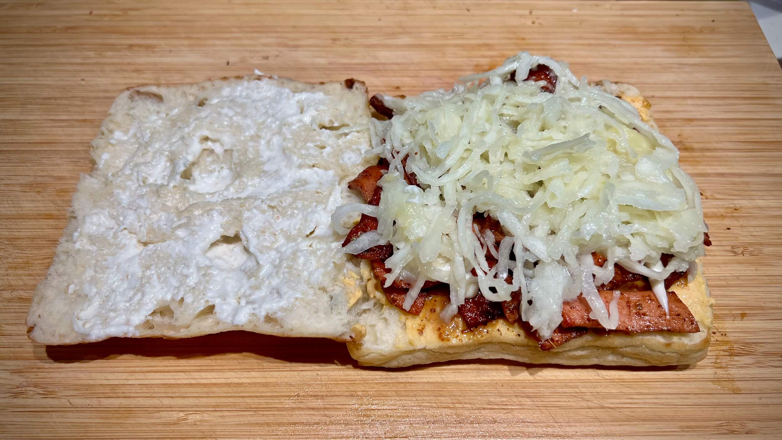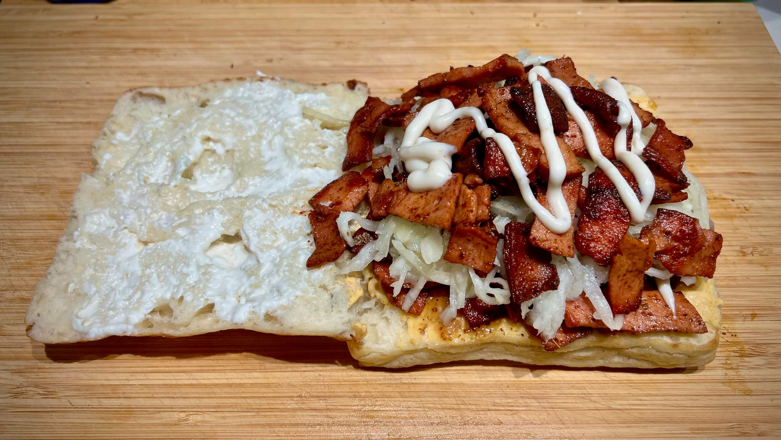 - Eine weitere Schicht Leberkäse hinzufügen und erneut etwas Knoblauchsauce darüber verteilen.
