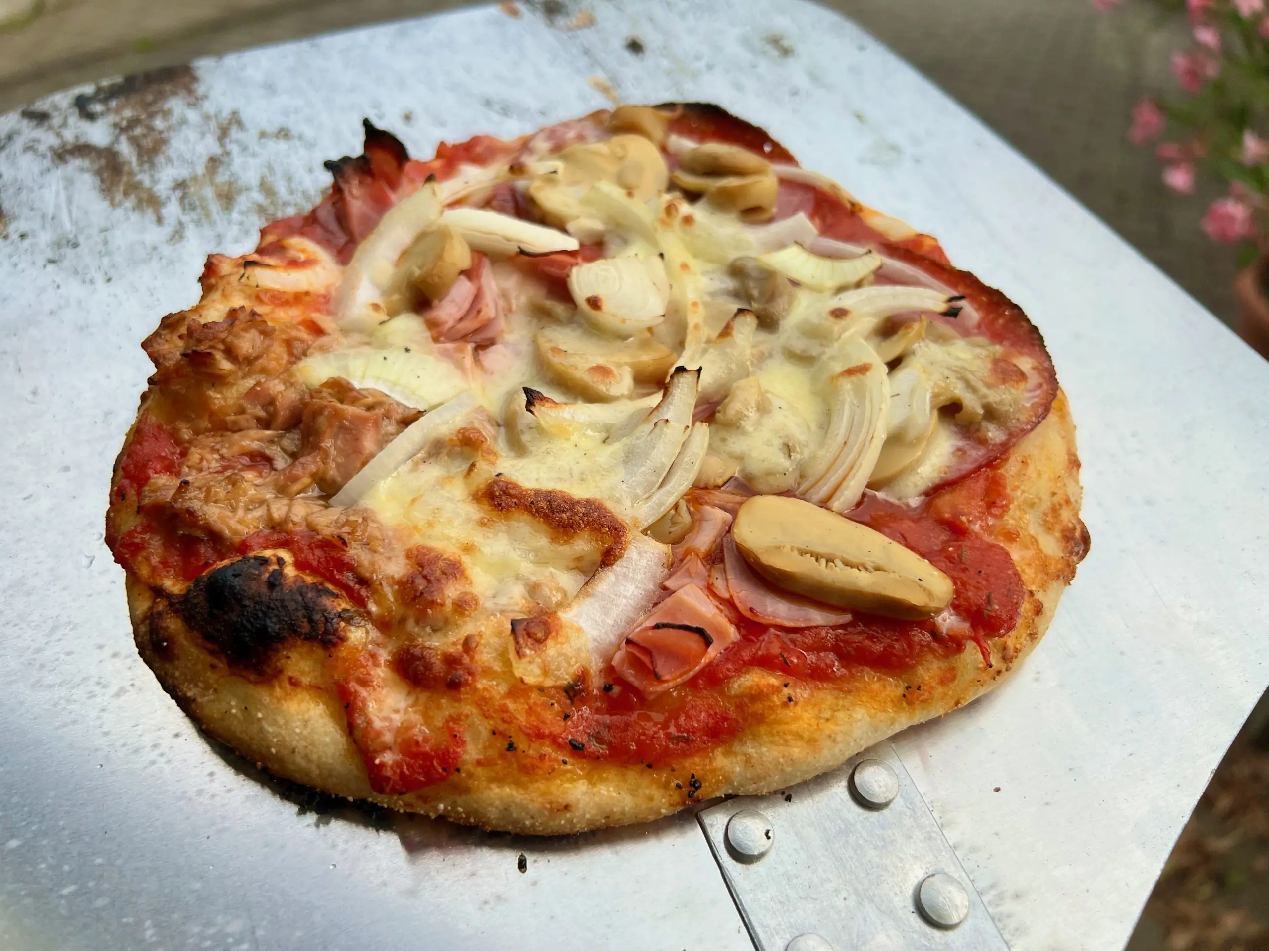 Mehl würde bei diesen Temperaturen sofort verbrennen, daher ist es nicht dazu geeignet, die Pizzaschaufel zu bestreuen, damit der Teig nicht kleben bleibt. Stattdessen empfiehlt sich etwas Grieß zu verwenden. Oder man nimmt ein Pizzagitter und legt dort die Pizza drauf. Ist der Teig im Ofen, sollte man ihn mit der Schaufel alle 30 Sekunden drehen, damit die Hitze überall gleichmäßig ankommt. Dazu bedarf es am Anfang etwas Übung.