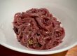 - Die Rumpsteaks in feine Streifen (2-3mm) schneiden und mit der Worcestersauce, der Sojasauce und dem Knoblauchgranulat marinieren.
