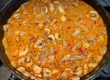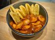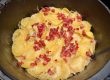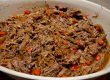 - Dann sollte man den Topf auf die Seite stellen und mit dem Schichten anfangen: Fleisch - Zwiebel und Paprika - Fleisch etc. Es sollte alles eng geschichtet sein, falls der Topf zu groß für die Fleischmenge ist, kann man den übrigen Platz mit Kartoffeln auffüllen. Am Schluß noch oben die BBQ Sauce darüber geben. Fertig.