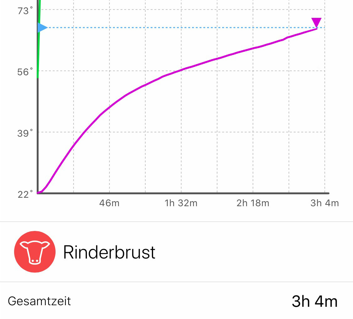 Wir legen die Rinderbrust auf den Rost und bringen unser Grillthermometer an. Jetzt sollte man darauf achten, dass die Brust eine Kerntemperatur von 68 °C erreicht, dann ist sie perfekt gegart. Bei unserem 2 kg Stück war das exakt nach 3 Stunden und 4 Minuten der Fall. Den Temperaturverlauf seht ihr unten in dem Diagramm.