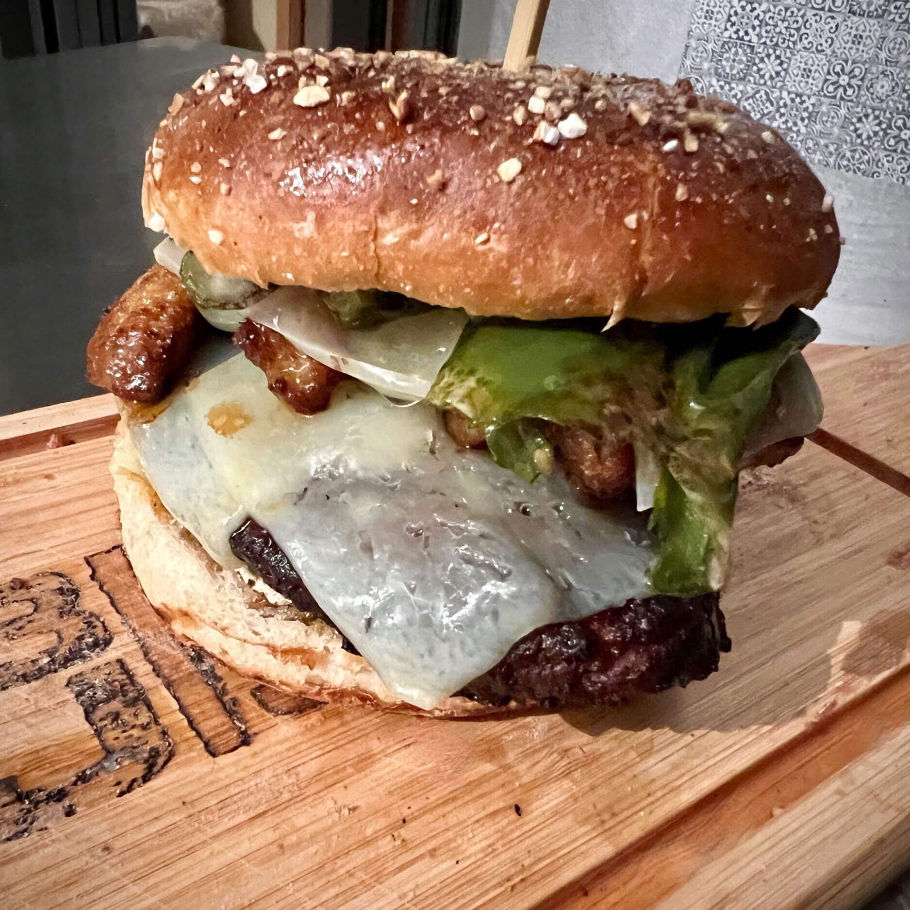 Nachdem es mehrere Dinge bei dem Burger gleichzeitig zu Grillen gibt, muss man etwas die Zeiten koordinieren, damit alles auf den Punkt fertig wird. Zunächst schneiden wir die Chorizo entweder in Scheiben, wenn sie dicker ist, oder (wie in unserem Fall) halbieren wird die Wurst und schneiden diese dann nochmals quer auf. Dann scharf auf dem Grill anbraten. Die Pimientos werden ebenfalls mit etwas Öl auf der Plancha scharf angegrillt, bis sie sich dunkler verfärben und Blasen bekommen. Die Buns rösten wir auf den Innenseiten leicht an. Die Patties werden medium gegrillt, dann kommt eine Scheibe Manchego darauf, dann legen wir die Chorizo drauf und wieder eine Scheibe Manchego. Am Schluß dann einige Pimientos.