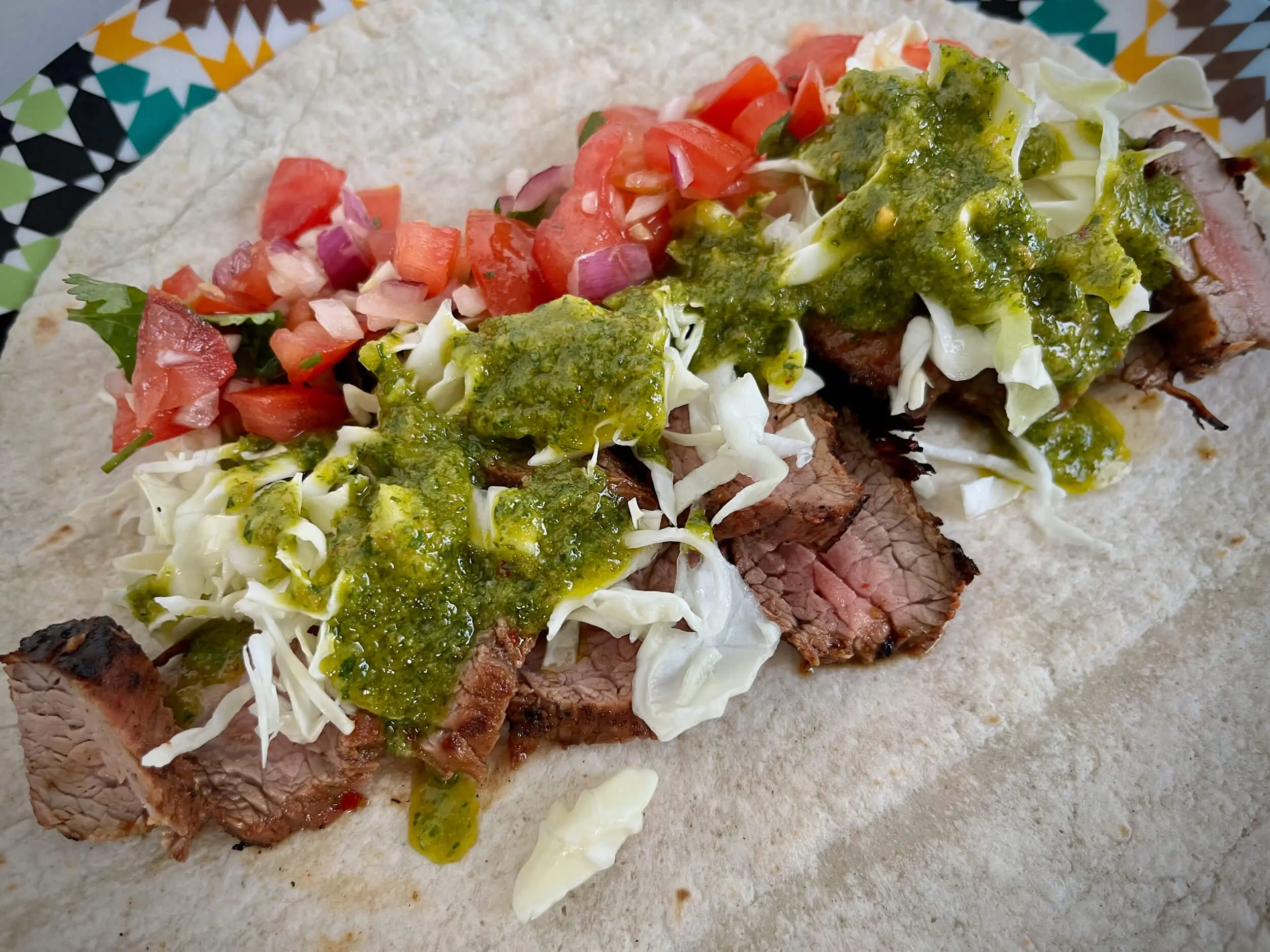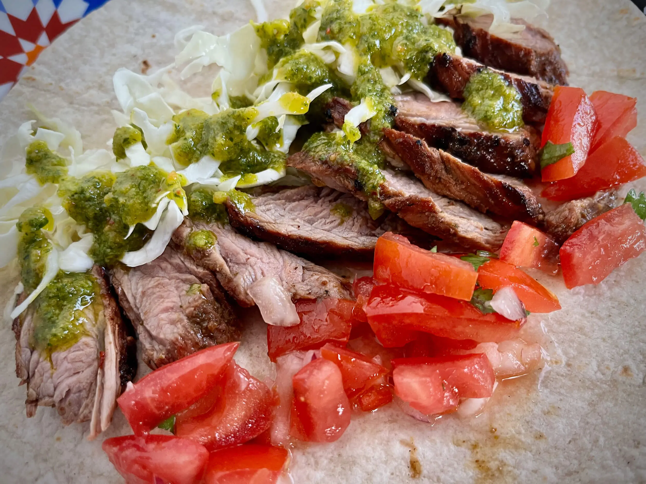 - Die Tortilla-Fladen werden indirekt kurz erwärmt und dann mit Carne asada, Pico de gallo, Salsa verde und Weißkohl belegt. Dabei wird jeweils eine Portion Fleisch mittig von links nach rechts verteilt und je nach Gusto durch entsprechende Zutaten ergänzt. Dabei sind der Kreativität natürlich keinerlei Grenzen gesetzt. Wir haben unsere Variation mit etwas Limettensaft abgerundet.