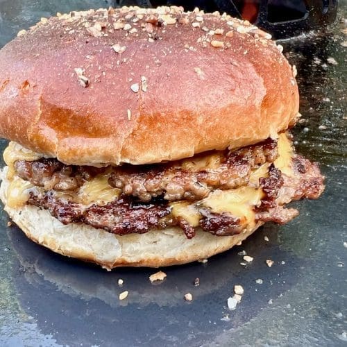Das Smashen der Fleischbällchen sorgt für eine besonders intensive Kruste und maximales Röstaroma durch die Maillard-Reaktion. Die dünne Form der Patties ermöglicht ein schnelles, gleichmäßiges Garen bei hoher Hitze. Der erhöhte Fettgehalt im Fleisch verbessert Saftigkeit und Krustenbildung und ist entscheidend für den typischen Smashburger-Geschmack.