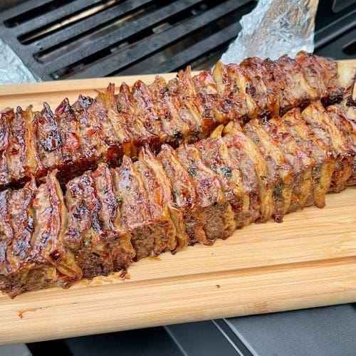 Die Spieße entweder auf der Plancha oder bei indirekter Hitze (ca. 200 °C) für etwa 15-20 Minuten grillen. Dabei gart das Hackfleisch gleichmäßig und das Lavash-Brot wird an den Kanten knusprig. Zu viel Hitze vermeiden, da das Brot sonst zu schnell bräunt.